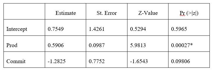 The table above presents the logistic regression output for the multivariate analysis. At a 95% level of significance, the P-value for the logistic regression models is zero for commitment but not zero for production. This means that the profit-sharing scheme influences the productivity output of employees in PK Mart. Thus the estimated coefficient (0.7549) in table 3 means that a unit change in profit sharing scheme results in 75% influence in Productivity. However, the commitment was statistically insignificant to scheme adoption. Thus the adoption of profit sharing scheme did not affect the commitment of employees based on PK Mart’s annual data.
