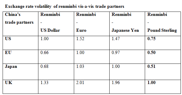 Exchange rate volatility published by China in August 2006 showed that sterling had the smallest variance against the renminbi, in relation to China’s other trade partners. The table above shows that sterling maintained the smallest variance against the renminbi even in the year 2008. As this variance is the smallest this may mean that there is scope for sterling to play a vital role by becoming the invoicing currency for Chinese exports. Having said that, it is worth noting that the UK and China are involved in significantly less volume of trade relative to China’s other trade partners and hence the scope for sterling being the invoicing currency in Chinese trade may be limited (Yi, 2008).