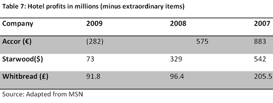 All three companies have reported lower profits over the course and Accor made a loss of €282m in 2009 due to the steep decline in revenue. Starwood’s profits would have been losses if not for the selling of assets. This indicates the sector is suffering again from a global slowdown.